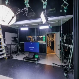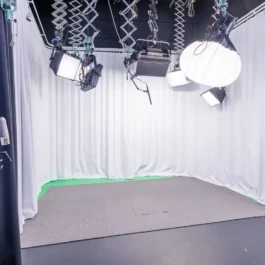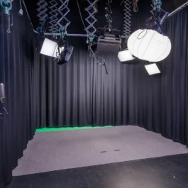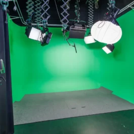 Broadcasting and recording studio for 1-5 persons with green screen. Separate production room.