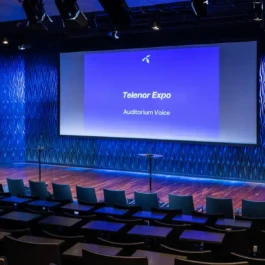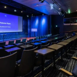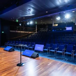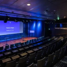Designed for conferences and large seminars. Optimized for streaming and videoconferences. Windows in the back of the auditorium can be blinded to gain light control.
