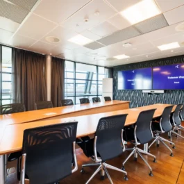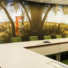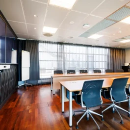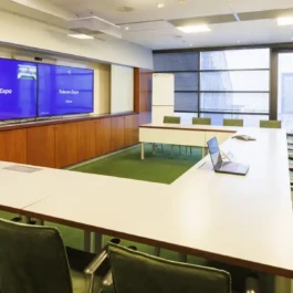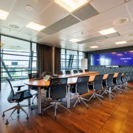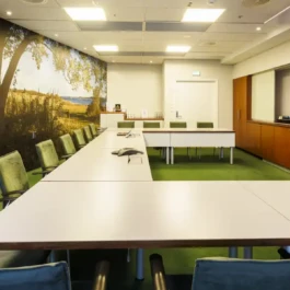 Auditorium with amphitheatre setup for 45 persons, in 3 table branches. Designed for small seminars and conferences, and very suitable for dialogue and interactivity.