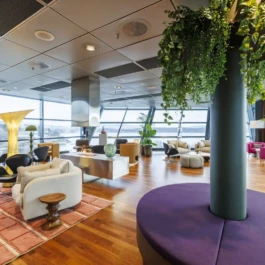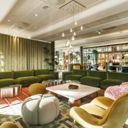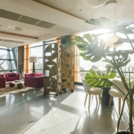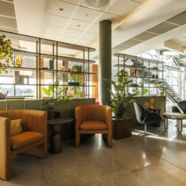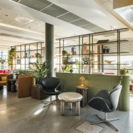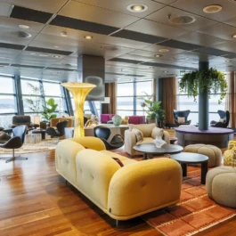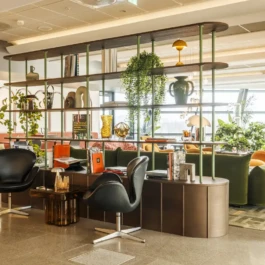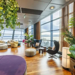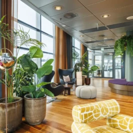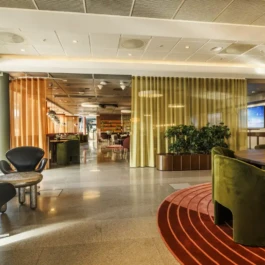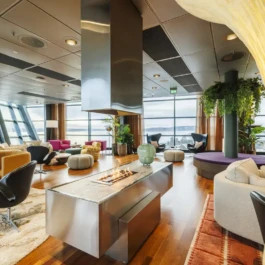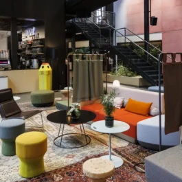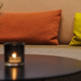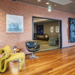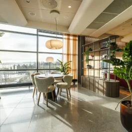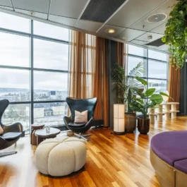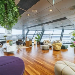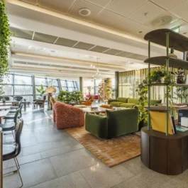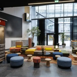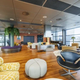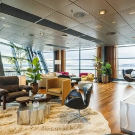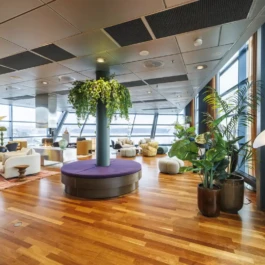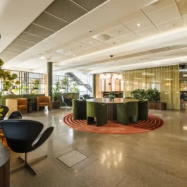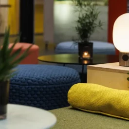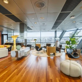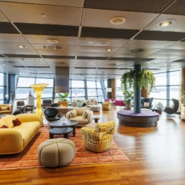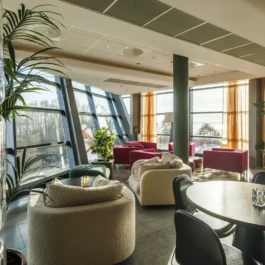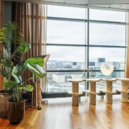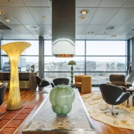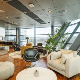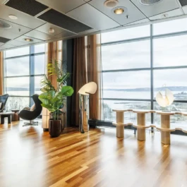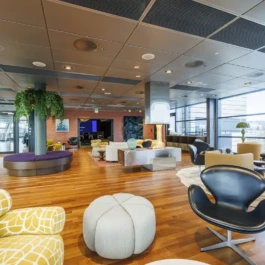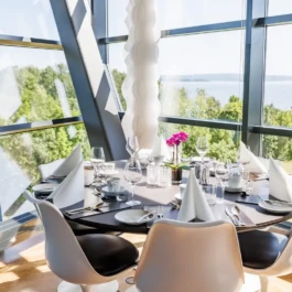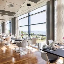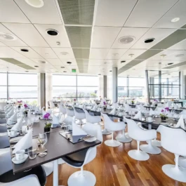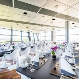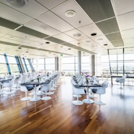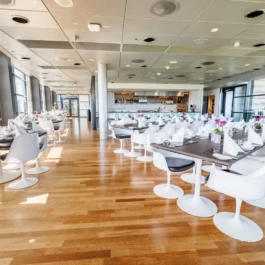 Auditorium with amphitheatre setup for 45 persons, in 3 table branches. Designed for small seminars and conferences, and very suitable for dialogue and interactivity.