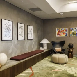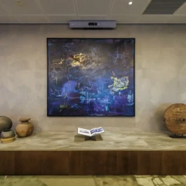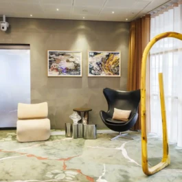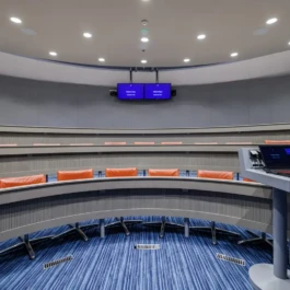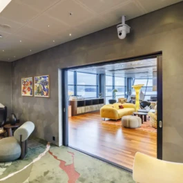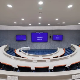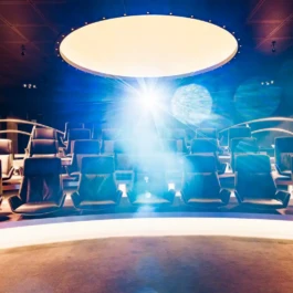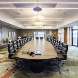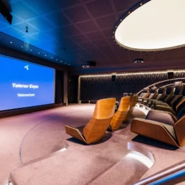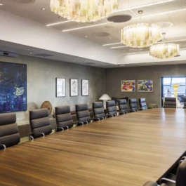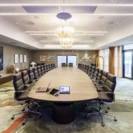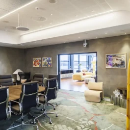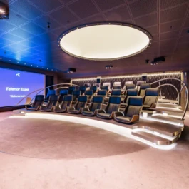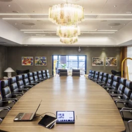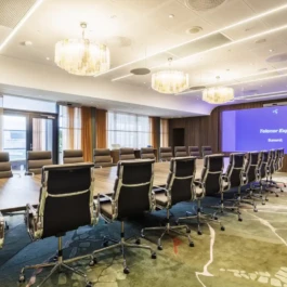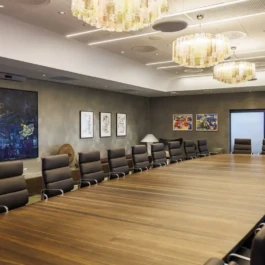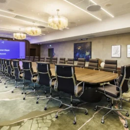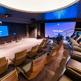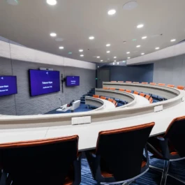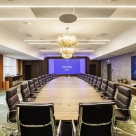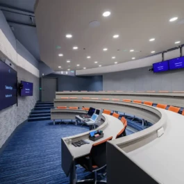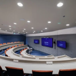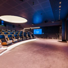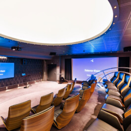 Auditorium with amphitheatre setup for 45 persons, in 3 table branches. Designed for small seminars and conferences, and very suitable for dialogue and interactivity.