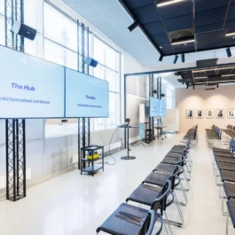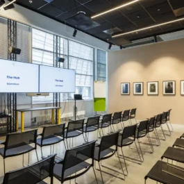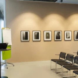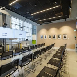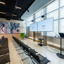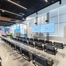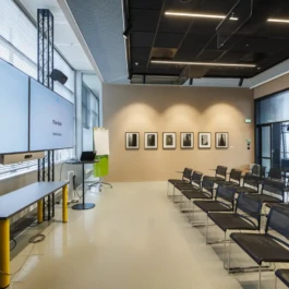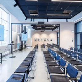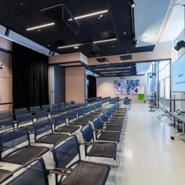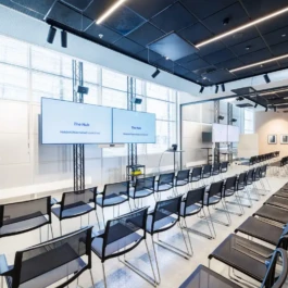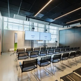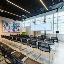 Designed for conferences and large seminars. Optimized for streaming and videoconferences. Windows in the back of the auditorium can be blinded to gain light control.